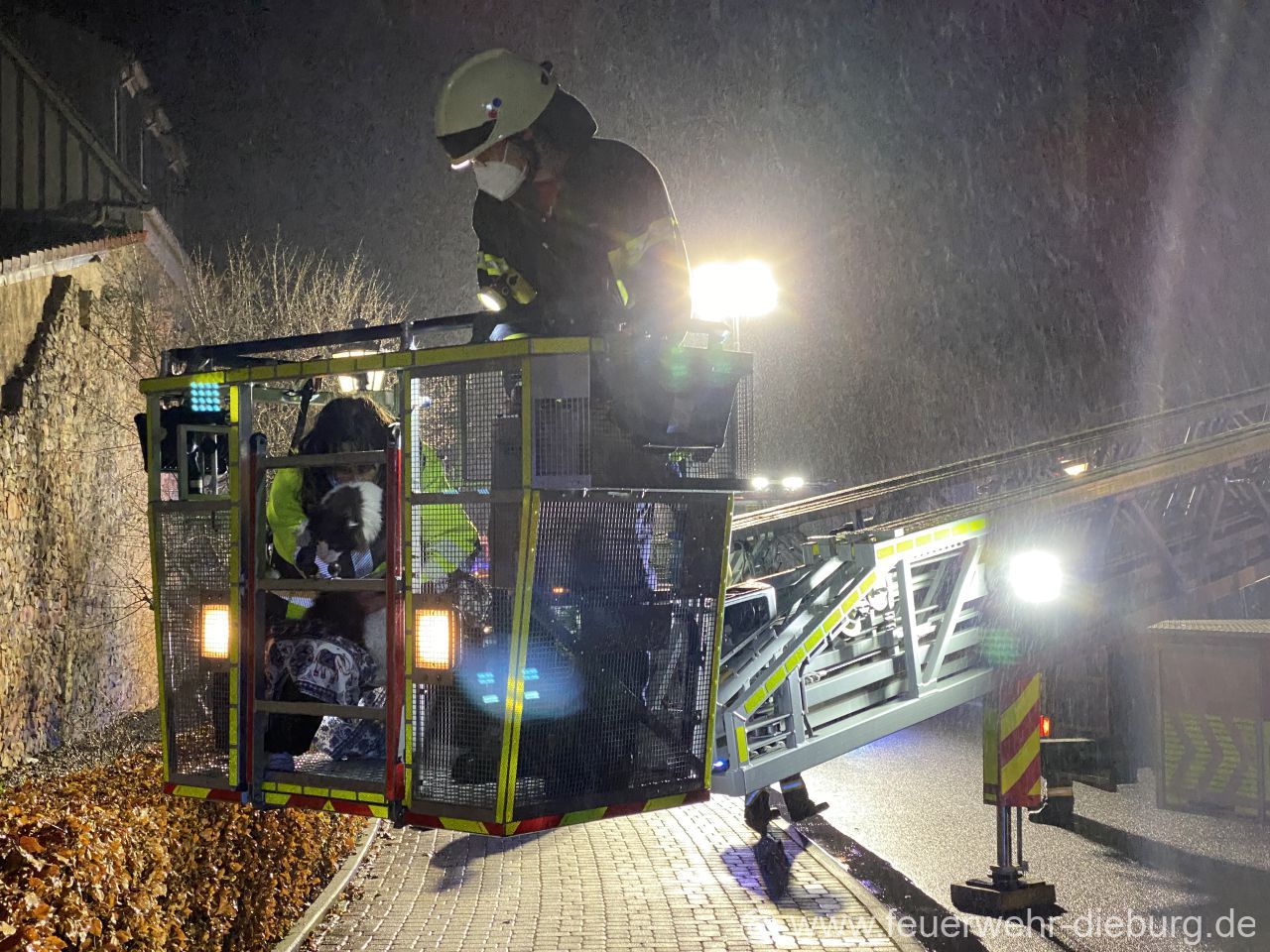 Stattdessen wurde die Drehleiter in Stellung gebracht und die Halterin der Katze gemeinsam mit dem Fahrzeugführer der Drehleiter mittels Korb in die Nähe des Tieres gefahren. Dort konnte der Kater Powi durch die Besitzerin wohlbehalten in Empfang genommen werden.