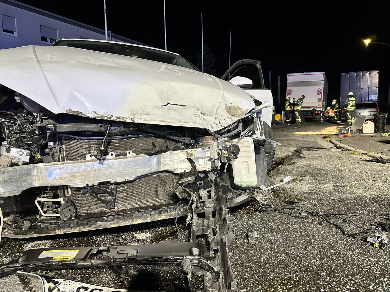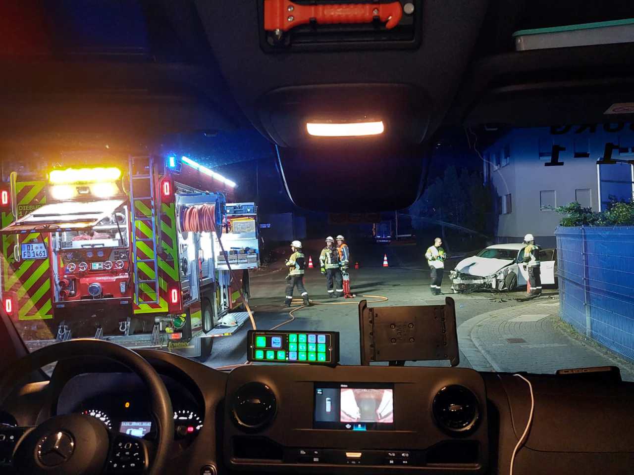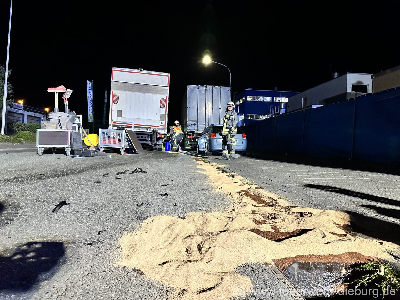 Im Kreuzungsbereich von Industrie- und Gewerbestraße kam es in der Nacht zum Freitag zu einem Verkehrsunfall zwischen einem PKW und einem LKW. Beim Eintreffen der Feuerwehr war bereits ein Rettungswagen vor Ort; die Fahrerin des PKW, in dem alle Airbags ausgelöst hatten, befand sich bereits zur Behandlung im Rettungswagen.
