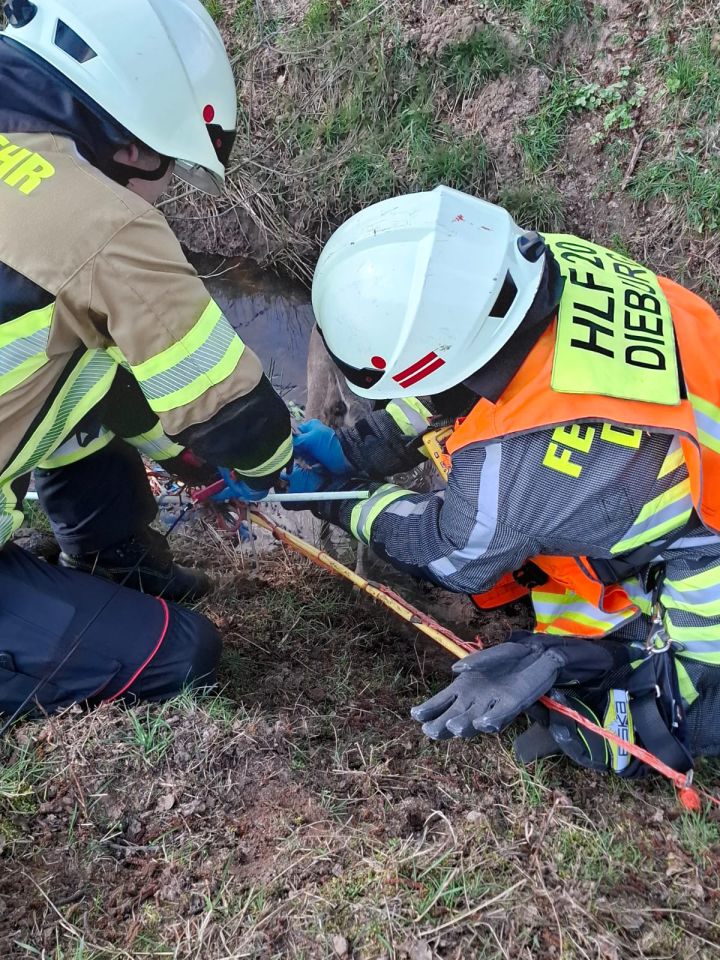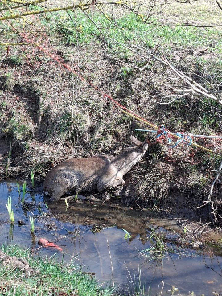 Vor Ort fanden sie einen jungen Rehbock vor, der in einem leicht wasserführenden Graben lag und sich mit seinem Geweih in einem unter Strom stehenden Weidezaun verfangen hatte. Das Tier versuchte mehrfach, sich selbst zu befreien, was jedoch ohne Erfolg blieb.