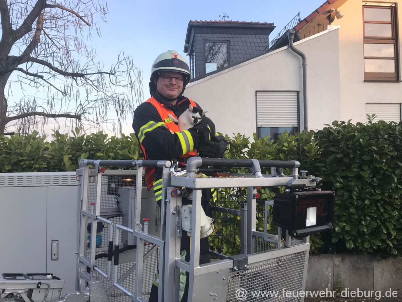 Direkt von einer Unterstützung des Rettungsdienstes in Groß-Zimmern wurde die Feuerwehr Dieburg zur Rettung einer Katze auf einem Baum in Dieburg alarmiert.